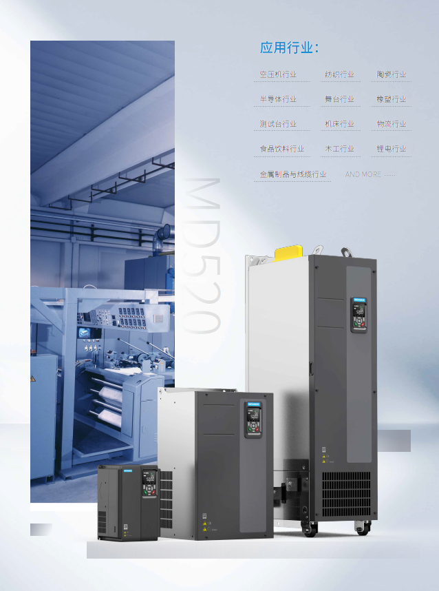 MD520系列變頻器是一款通用高性能電流矢量變頻器,主要用于控制和調(diào)節(jié)三相交流異步電機(jī)和三相交流永磁電機(jī)的速度和轉(zhuǎn)矩,可用于紡織、造紙、拉絲、機(jī)床、包裝、食品、風(fēng)機(jī)、水泵及其他自動化生產(chǎn)設(shè)備的驅(qū)動。